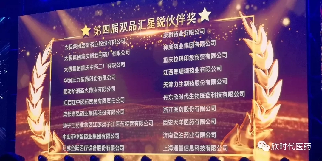 2019年3月24日,“第四屆中國品牌藥店工商峰會(雙品匯)”圓滿閉幕。本次峰會,丹東欣時代生物醫藥科技有限公司榮獲雙品匯星銳伙伴獎。