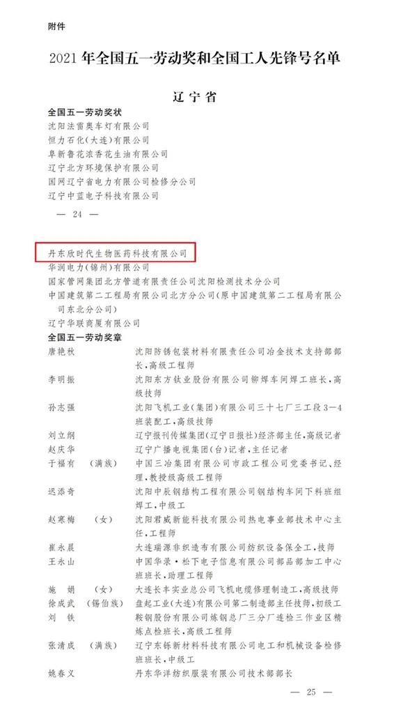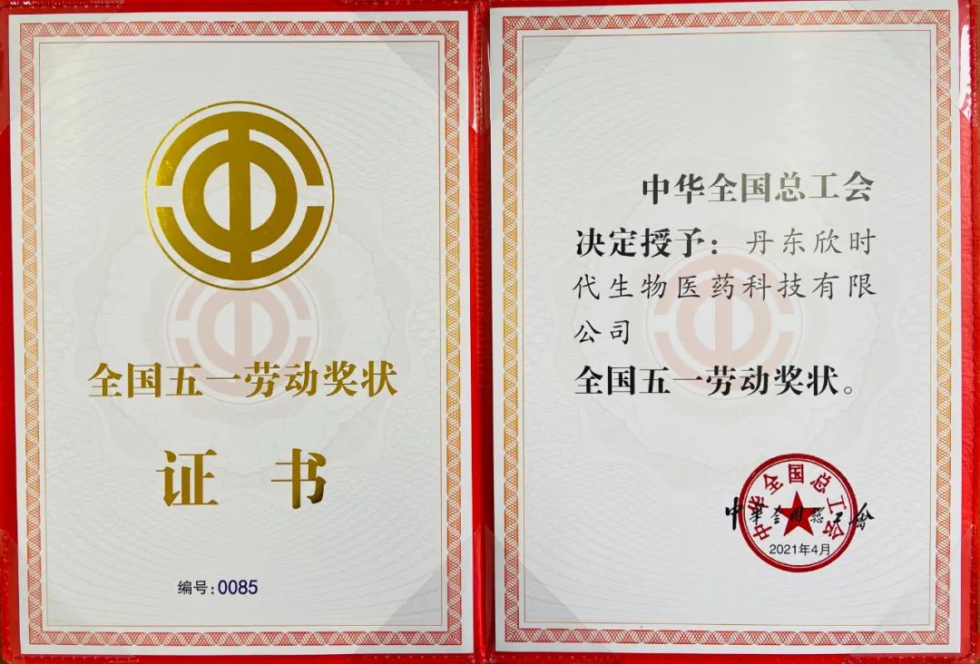 丹東欣時代生物醫藥科技有限公司被中華全國總工會授予“2021年全國五一勞動獎狀”。